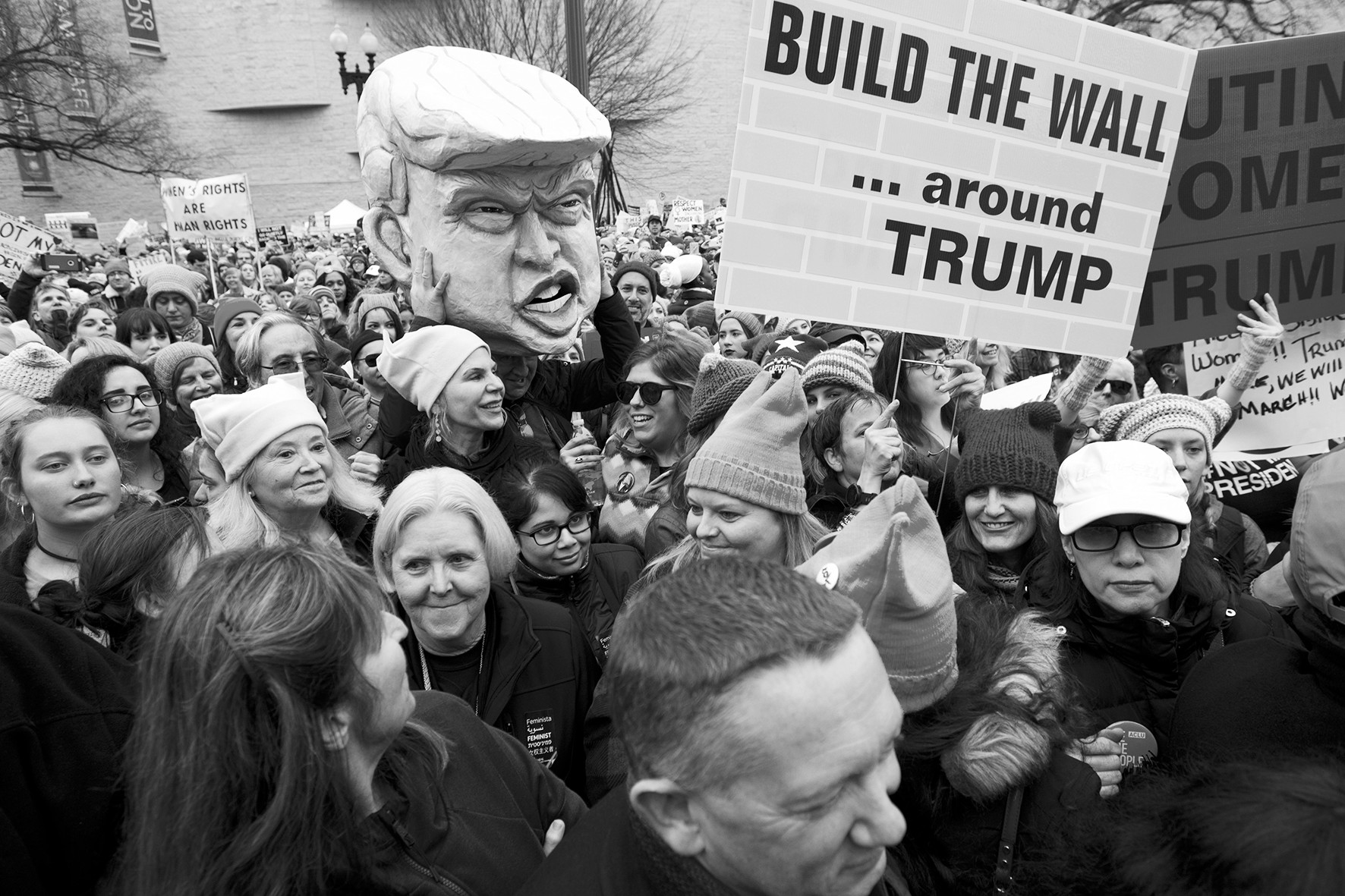 21日,数十万人聚集在华盛顿参加女性大游行,图中标语为“在特朗普周围筑道墙吧”。