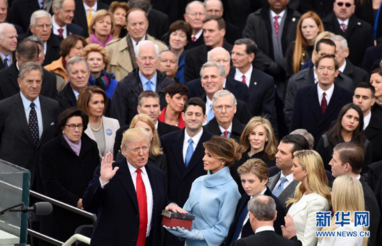 1月20日,在美国首都华盛顿国会山,特朗普在美国第45任总统就职典礼上宣誓。当日,美国当选总统、共和党人特朗普在美国首都华盛顿国会山举行的就职典礼上正式宣誓就任美国第45任总统。 新华社记者殷博古摄