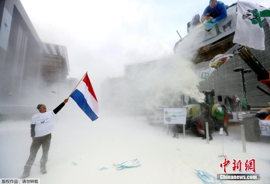 当地时间2017年1月23日,比利时布鲁塞尔,欧洲奶农在欧盟理事会大楼外喷洒奶粉抗议奶市场危机,而欧盟各成员国农业部长们当时正在这座变成奶白色的大楼中召开2017年首次部长级会议。