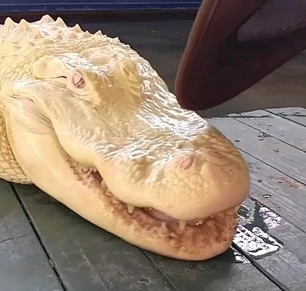 鳄鱼佩尔长约2.3米,重约48千克,已经10岁了,在鳄鱼岛主题公园已经生活了7年。拍摄该视频时,佩尔正好因为饲养员用帽子碰了它的鼻子调笑它而冒出水面,试图夺回这顶帽子。它并没有显得无精打采,粉色的眼睛反倒让人们难以看出它的视线在何方。