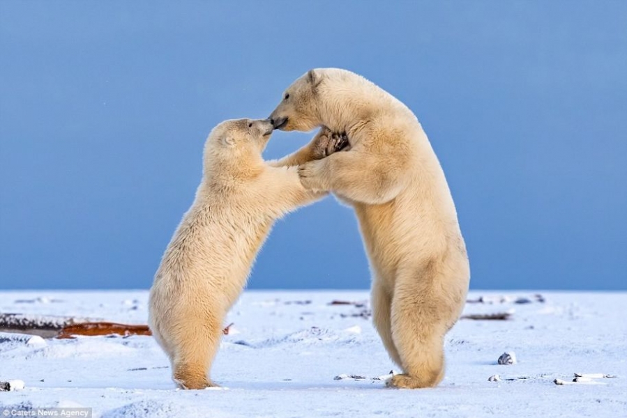 据英国《每日邮报》1月24日报道,近日,摄影师Shayne McGuire捕捉到了两只小北极熊超有爱的一幕。这两只小北极熊在等待母亲捕食回来的时候,在雪地里手牵手仿佛跳起了华尔兹一样,甚至还给了对方一个温暖的吻。Shayne表示:“一般情况下是不会发生这样的事情的。”