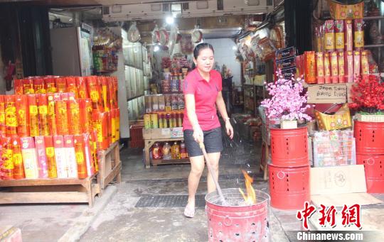 一家卖香烛、金纸的店前,店员正在烧金纸 林永传 摄