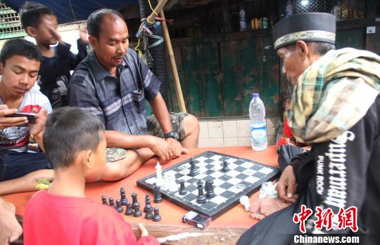 一位摊主在摊位上和人下国际象棋. 林永传 摄