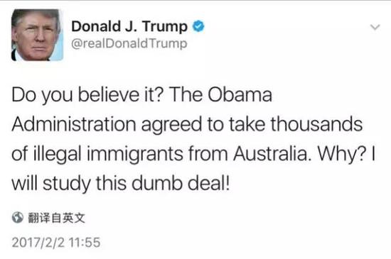 “你们能相信么?!奥巴马政府居然同意把澳大利亚成千上万的非法移民接到美国来!这是为什么?让我好好研究研究这个傻X协议!”