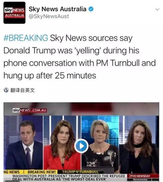 特朗普在推特上“直播批奏”,指名道姓怒斥与澳大利亚达成的难民协议,让澳大利亚媒体炸了锅。有媒体爆料称,早在特朗普发推之前,特朗普和澳大利亚总理特恩布尔就这个协议通过电话,在通话中特朗普是一顿吼(yelling),吼完之后还把电话挂了。