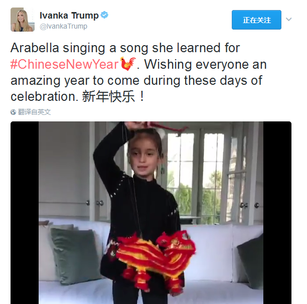 2日一大早,伊万卡发了这样一条推文:“阿拉贝拉唱着她从中国新年学到的歌曲,在这节日庆典之际,祝愿每个人都有个精彩的新年。新年快乐!”其中最后“新年快乐”4字是用中文所写,并配发了女儿用普通话演唱中国歌曲《新年好》的视频。