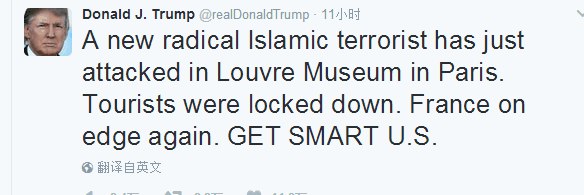特朗普3日发表推文说:“一个新的激进伊斯兰恐怖分子刚刚在巴黎卢浮宫发动攻击。游客滞留当地。法国又陷入紧张。美国,聪明点。”