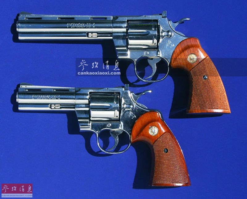 图为美国柯尔特公司于1955年推出的“蟒蛇”(Python)系列双动式(只需手压一次击垂,可击发多次)左轮手枪,使用.357口径手枪弹药,采用6发转轮弹仓供弹。由于性能出众,该系列的生产线一直持续到2005年。图为2种蟒蛇手枪,上为6英寸型(枪管长15厘米),下为4英寸型(枪管长10厘米)。