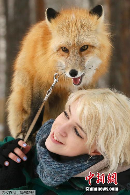 2月8日,俄罗斯克拉斯诺亚尔斯克Royev Ruchey动物园,一位动物园员工正在训练11个月大的红狐狸。这是该动物园驯养野生动物计划的一部分。