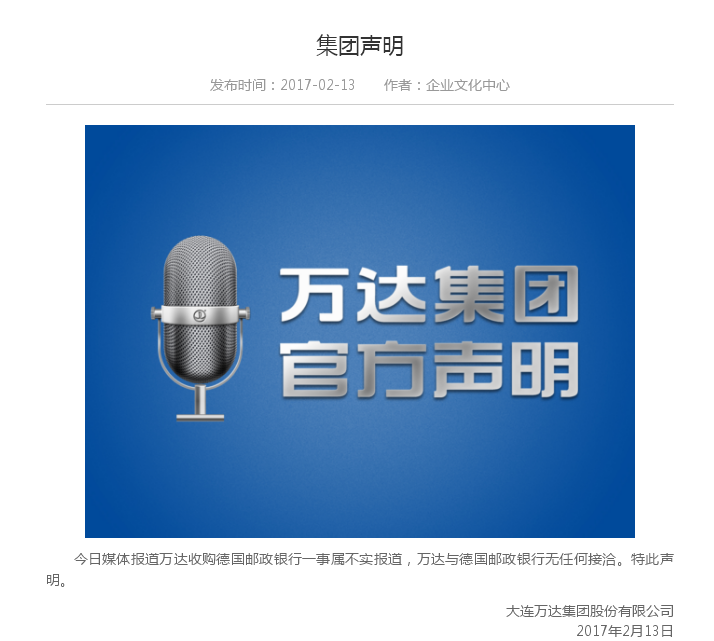 【环球时报—环球网报道 记者 杨沙沙】针对英国《金融时报》13日报道称,中国首富王健林旗下万达集团近期准备收购德国邮政银行,万达方面13日对《环球时报》回应称,该消息属不实报道,万达与德国邮政银行无任何接洽。