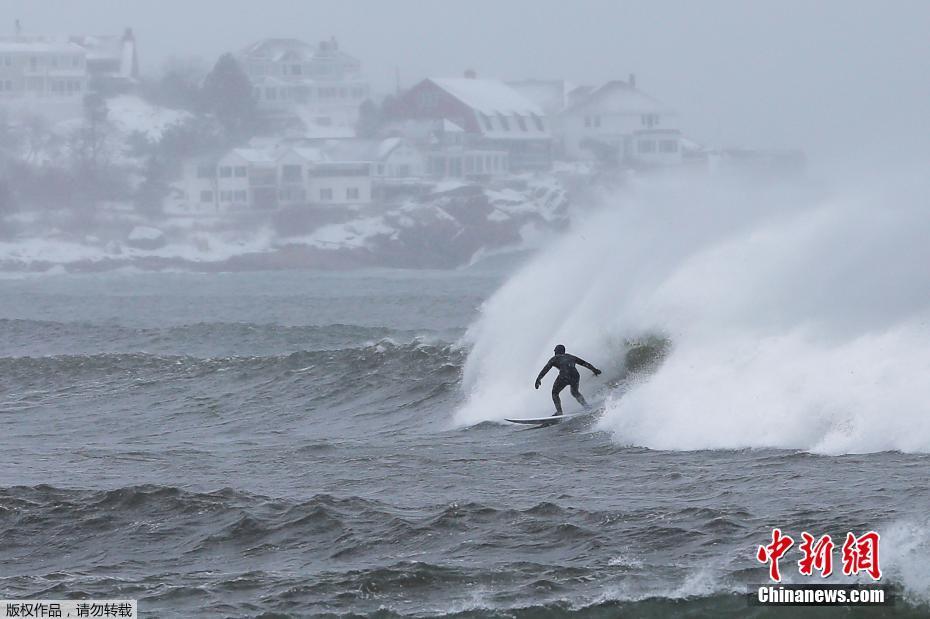 当地时间2月13日,美国马萨诸塞州持续暴风雪,冲浪者不畏严寒在大浪中上下翻飞。