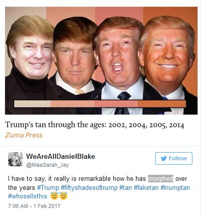 据报道,此前社交媒体上本来已对这两位首脑的会晤展开过一轮嘲讽,当时的嘲讽对象是特朗普与特鲁多在握手时“奇怪”的表情。这张最新的现场照片显示,特朗普脸部整体肤色为一贯的偏橙色,但被吹起的头发下方,有一片皮肤却是白色的。一些网友再次借此质疑特朗普可能是使用了“晒黑剂”才让脸部皮肤变古铜色的。有不少网友嘲讽特朗普或许对“晒黑剂”明显使用不当,或未能完全调和这种化妆品的猜测和评论。一名网友说:“太有趣了,特朗普的头发和晒黑剂都很好。”实际上,外人对特朗普古铜色皮肤的评论已不是第一次出现了。在2月12日的格莱美颁奖晚会上,说唱歌手巴斯达韵(Busta Rhymes)将特朗普称为“橙剂总统”。