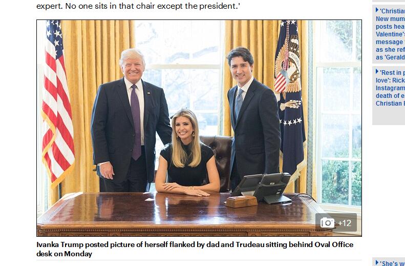 美国第一女儿周一在白宫的政策会议上首次露面,与到访的加拿大总理贾斯廷 特鲁多和她父亲特朗普讨论建立工作小组帮助商业女性。会议期间她发推文说,“就女性占有一席之地的重要性,与两位世界领袖进行了成功的讨论。”并附上一张在椭圆形办公室的照片:伊万卡坐在办公桌后面,美国总统站在右边,把手搭在她背上,加拿大总理站在她左边。