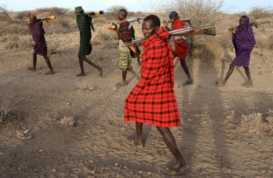据路透社2月14日报道,肯尼亚10日宣布,持续干旱已酿成“国家灾难”。肯尼亚总统肯雅塔发表声明,呼吁国际伙伴伸出援手,帮助肯尼亚度过这场严重的旱灾。在肯尼亚旱灾肆虐的北部,全副武装的“牛仔”闯进农场和野生动物保护区为牲畜争夺水源,导致暴力冲突频发,造成至少11人死亡,一家宾馆被烧毁。图为Turkana部落男性牧民扛枪巡视牧区,严防敌对部落“入侵”。编译刘扬子(参考消息独家编译,转载请注明出处)