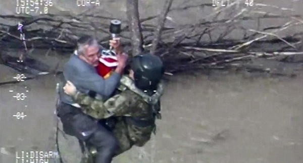 来自泰勒斯维尔市的麦克默特里被洪水从车中冲出,一直冲至普卢马斯县9号公路附近。绝望之中,他只得紧紧抓着旁边的树枝。幸运的是,加利福尼亚州国民护卫队当时正在附近巡航,在发现麦克默特里身处险境后,他们果断采取了营救措施,并成功地将其从洪水中救出。