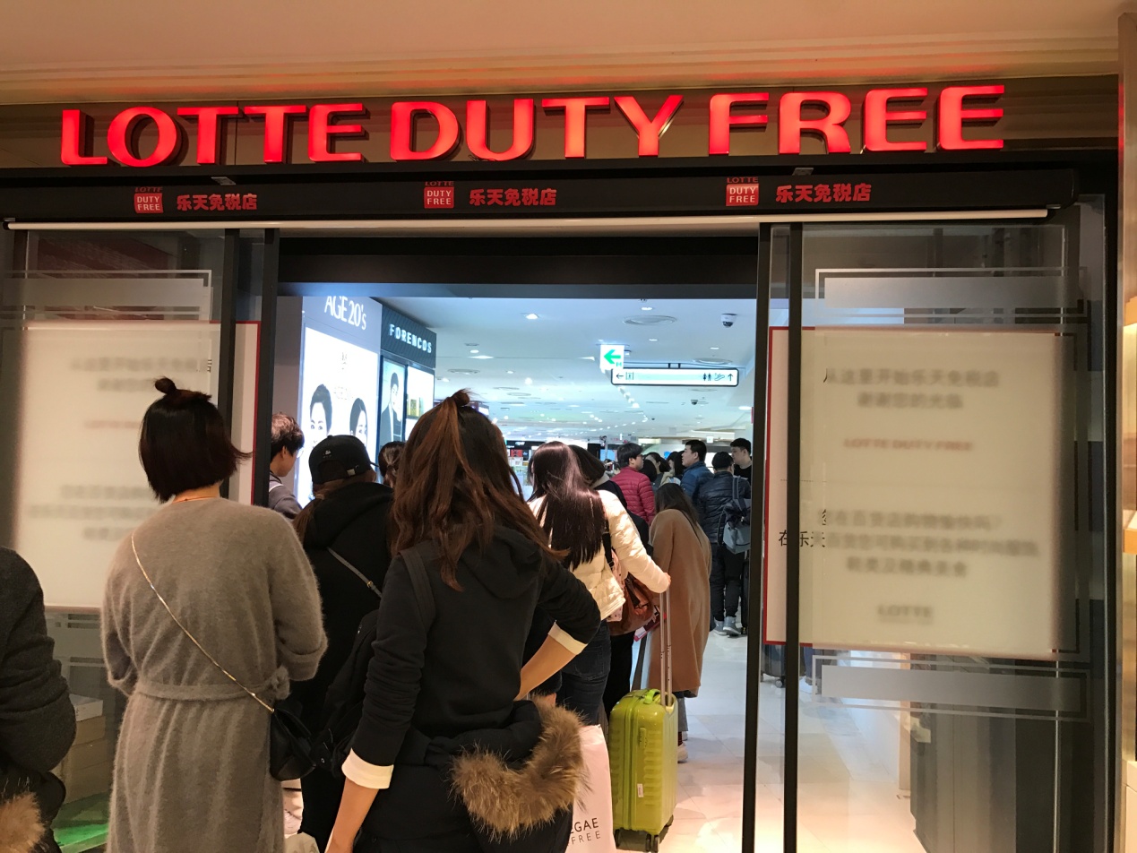 19日,首尔小公洞乐天免税店里,中国游客排队结账。