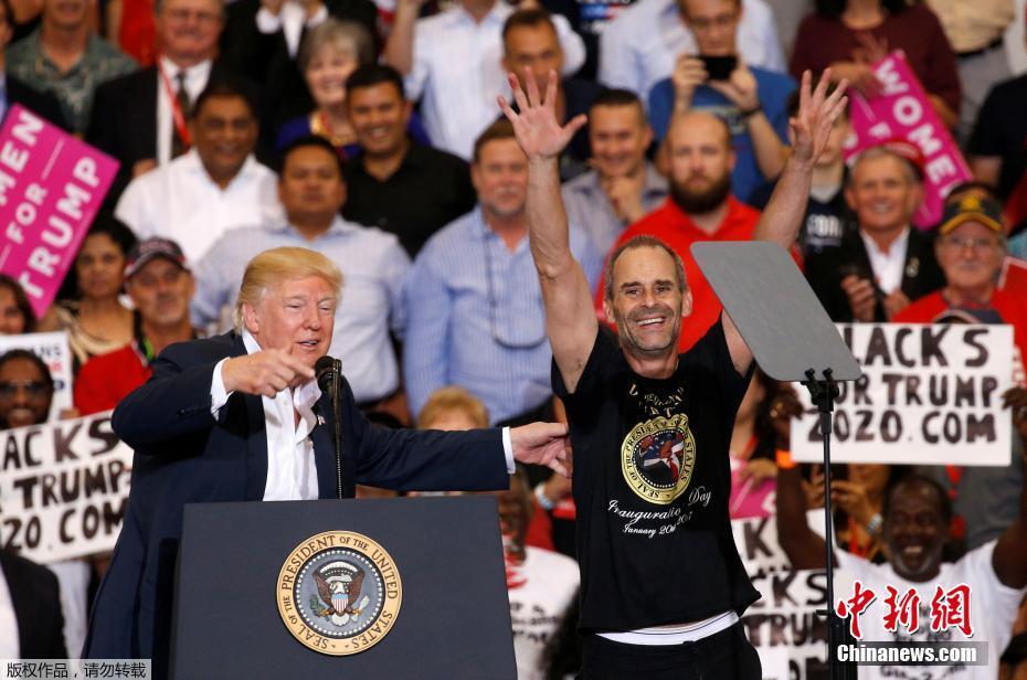 当地时间2017年2月18日,美国佛罗里达州墨尔本,美国总统特朗普在奥兰多-墨尔本国际机场举行演讲。在演讲过程中,特朗普邀请观众席的一名支持者跳过防护栏到台上。在这名支持者翻越防护栏上台的同时,特勤局保镖试图阻止他的举动,但被特朗普叫停。