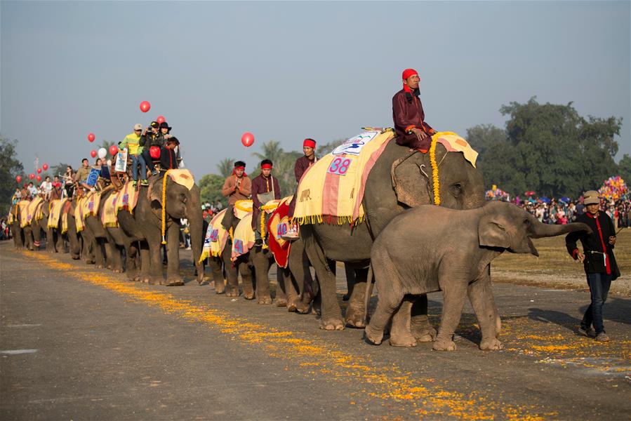 2月18日,在老挝的沙耶武里省,几头大象参加大象节的大象游行。新华社/路透