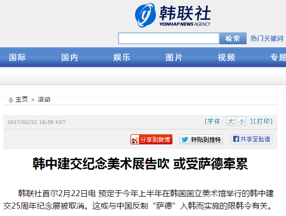 【环球网报道 记者 任梅子】韩联社2月22日报道称,原定于今年上半年在韩国国立美术馆举行的中韩建交25周年纪念展被取消。韩联社认为,这或与中国反制“萨德”入韩而实施的“限韩令”有关。