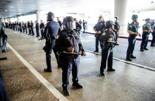 2月4日,在美国洛杉矶国际机场,警察在当地反对特朗普移民政策的游行示威现场值勤。(新华社发)