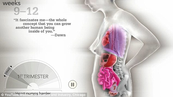 【环球网综合报道】 据英国《每日邮报》2月23日报道,近日,美国芝加哥科学工业博物馆制作了一则视频,展现了妇女怀孕时身体内各器官的变化过程,同时还配有不同的母亲描述自己怀孕期间的感受。用户可以自由地选择视频中的不同怀孕阶段进行观看。
