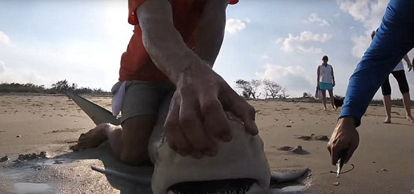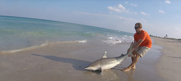 视频中,一名身穿橙色T恤、戴着黑色墨镜的男子飞快地奔向沙滩,然后在水中拖拽着一条鲨鱼的尾巴。鲨鱼奋力抗争,拼命地扭动着身子想要重回大海。中途,男子一度手滑松开了鲨鱼的尾巴。最终,鲨鱼抵不过男子的生拉硬拽被拖上了岸。