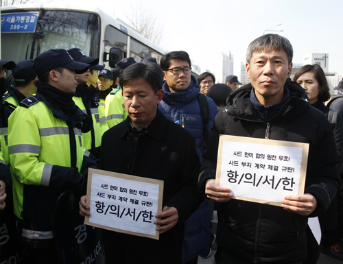 2月28日,在韩国首尔的韩国国防部门前,韩国民众代表手持抗议部署“萨德”系统的信函。新华社记者姚琪琳摄