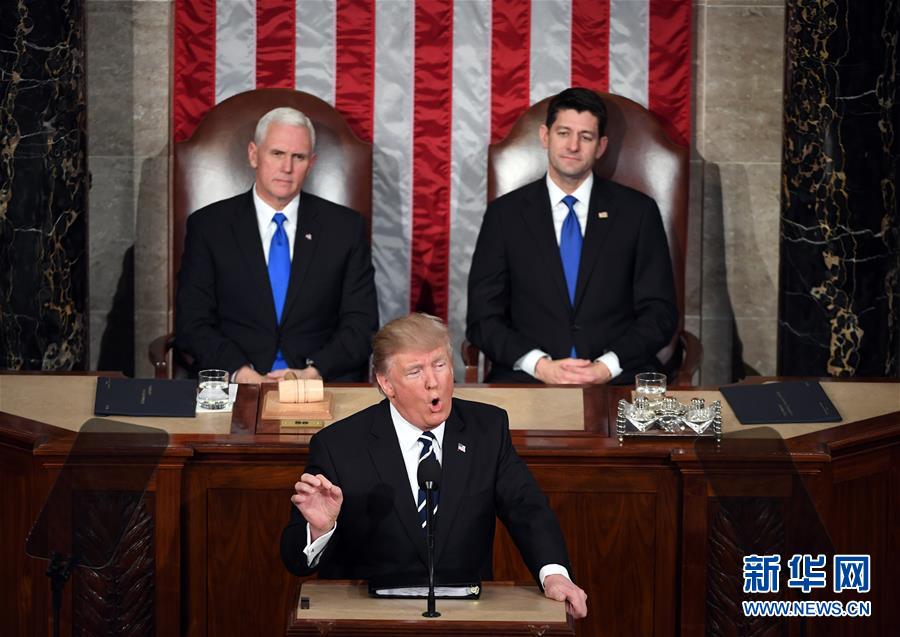 2月28日,美国总统特朗普(前)在华盛顿国会山发表演讲,副总统彭斯(后排左)和众议院议长保罗·瑞安(后排右)出席。美国总统特朗普28日晚在国会发表上任后的首次演讲,呼吁国会支持万亿美元基建计划。新华社记者殷博古摄