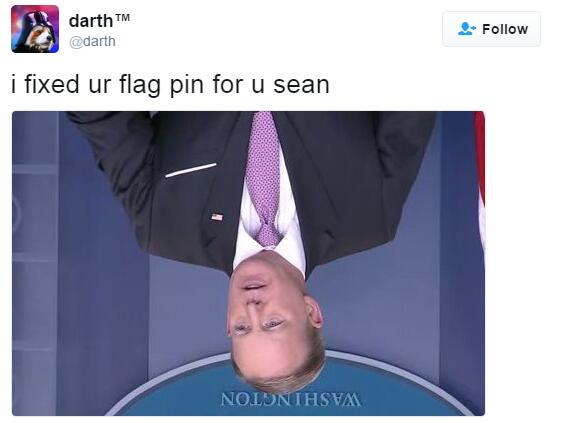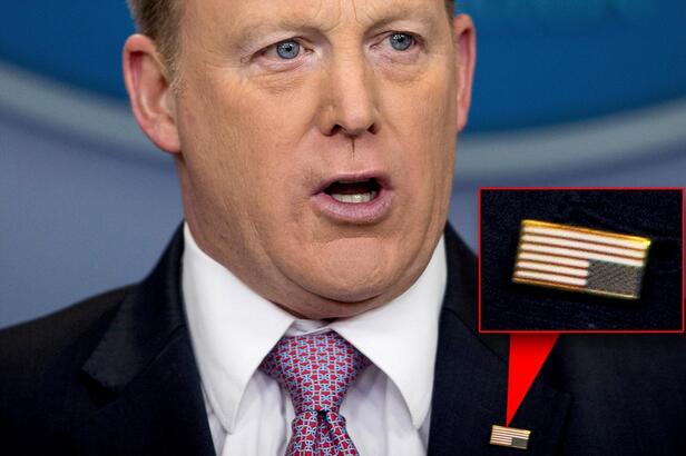 【环球网综合报道】美国中文网3月10日援引今日美国消息称,在10日的白宫新闻简报会上,白宫新闻发言人斯派塞闹了一个不大不小的笑话:他胸前佩戴的美国国旗徽章竟然戴反了。
