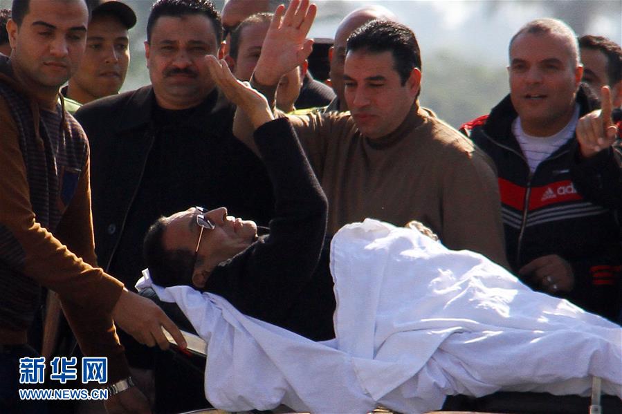 据埃及《金字塔报》消息,埃及总检察长3月13日下令释放前总统穆巴拉克。这张2014年11月29日拍摄的资料照片显示,在埃及首都开罗,埃及前总统穆巴拉克(前)从马阿迪军事医院被运送上直升机,前往法庭。新华社发(艾哈迈德·戈马摄)