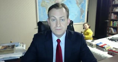罗伯特当时正在家中接受BBC关于韩国政治相关问题的在线直播采访,突然房门被打开,接着一个身穿黄色毛衣、戴着眼镜的小女孩大摇大摆地走了进来。在镜头中看到女儿的罗伯特显然有些分心,内心也是焦灼不安,没想到女儿不仅没有离开,反而径直走到他身旁,一起进行“直播”。罗伯特的眼睛直盯着屏幕,只是伸出一只手将女儿往后搡了搡。但女儿并没有意识到父亲在工作,于是干脆坐在一边把玩起手里的玩具来。