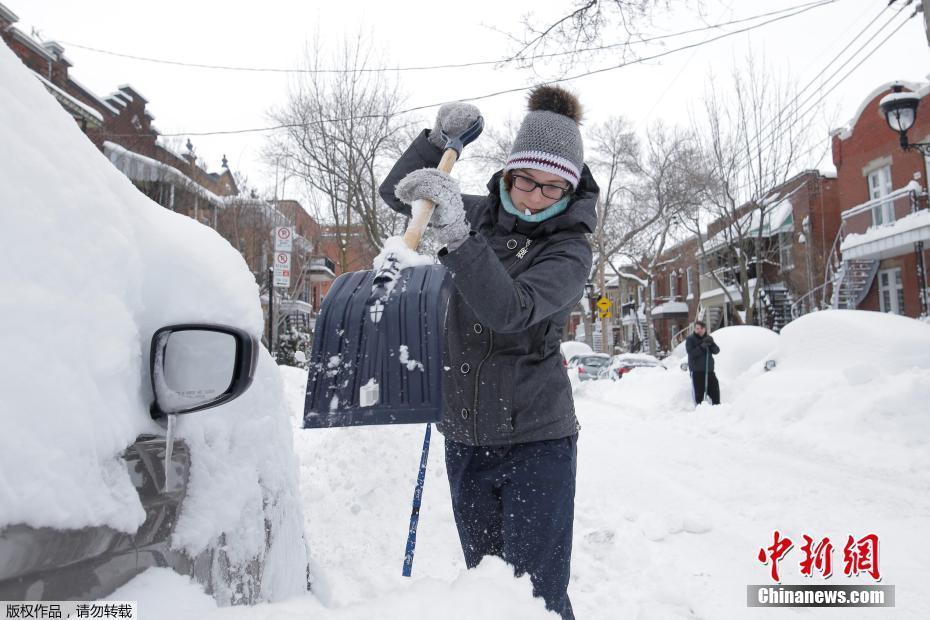 当地时间2016年3月15日,加拿大蒙特利尔,当地遭暴风雪袭击,部分地区降雪超过60厘米。停在路边的私家车被积雪覆盖,民众用各种工具在雪堆里“找汽车”。