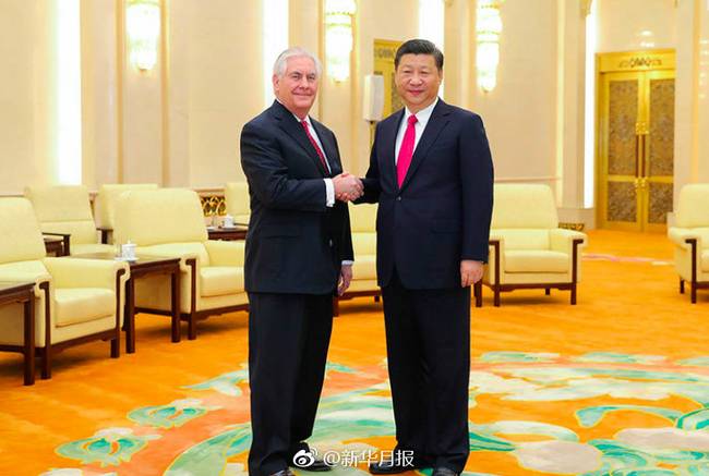 19日,中国国家主席习近平在人民大会堂会见美国国务卿蒂勒森。蒂勒森转达了美国总统特朗普对习近平主席的问候,表示特朗普总统高度重视同习主席的通话联系,期待着尽早举行两国元首会晤,并有机会对中国进行访问。为美中关系未来50年的发展确定方向。美方愿本着不冲突不对抗、相互尊重、合作共赢的精神发展对华关系,不断增进美中相互了解,加强美中协调合作,共同应对国际社会面临的挑战。