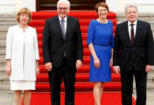 中新网3月20日电 据外媒报道,德国总统高克的任期本月结束。在柏林“美景宫”高克与其伴侣沙德(Daniela Schadt)19日迎来总统府的新主人施泰因迈尔夫妇。