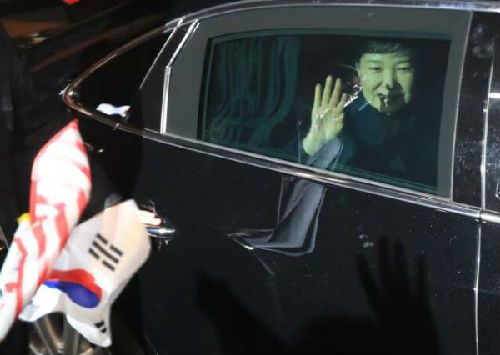 3月12日,朴槿惠乘车抵达位于韩国首尔三成洞的私邸并向支持者挥手。(新华社/法新社)