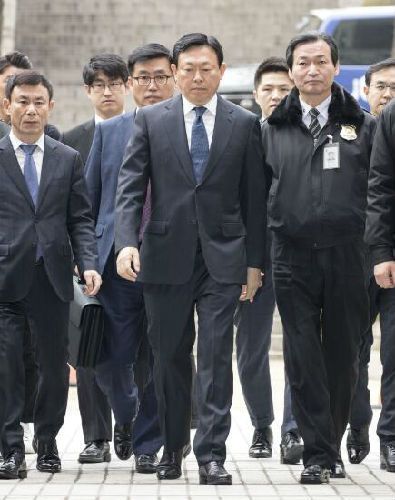 3月20日,乐天集团会长辛东彬(中)到达韩国首尔中央地方法院,准备出席庭审。当日下午,首尔中央地方法院开庭审理乐天集团会长辛东彬及其家人所涉的一系列案件。(新华社)