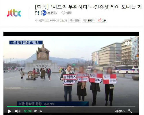 据韩国JTBC电视台报道,一家韩国化妆品企业近日自觉选择“站队”,其员工在首尔市区公开举行示威活动,他们举着用中英韩文写的“反对萨德”的标语,以表明自己对于现政府部署“萨德”的反感。