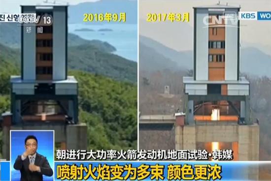 原标题:朝进行大功率火箭发动机地面试验 韩媒:喷射火焰变多束 颜色更浓