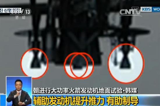 19日,朝鲜中央电视台以配图的方式,播送了朝鲜进行新型大功率火箭发动机的地上点火试验的消息。