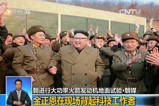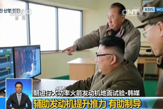 朝鲜中央电视台主持人:敬爱的最高领导人金正恩同志,对新型大功率发动机地上点火试验取得成功,表示极大满意。