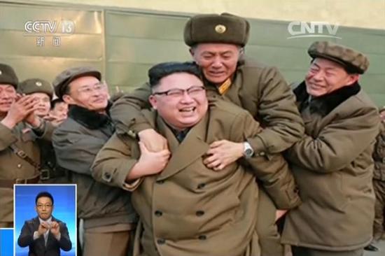 朝媒公开金正恩背起科技工作者照片,朝鲜中央电视台的报道中,还出现了金正恩兴奋地背起科技工作者、与工作人员拥抱、手挽手合影的照片。