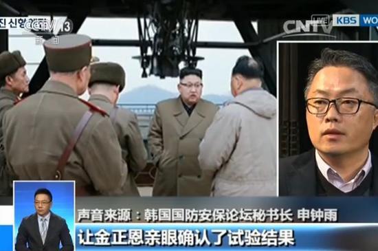 韩国国防安保论坛秘书长 申钟雨:(朝鲜)完成了把发动机装载到洲际弹道导弹上的最后一个阶段,即装载辅助发动机后,让金正恩亲眼确认了试验结果。