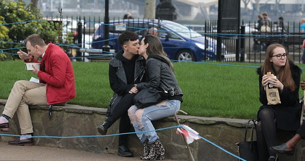 视频中,这对女同夫妇在路边亲吻时,旁边的一对情侣注意到了她们,其中的男子立刻叫自己的女友回头看这对特殊的恋人。在其中一段录像中能看到,这对女同夫妇在伦敦的一个地铁站台上拥吻时,一名西装革履的男子紧紧盯着她们。而在另一段录像中则看到,两位老妇人面对拥吻的夫妇俩一脸嫌弃地皱起了眉头。