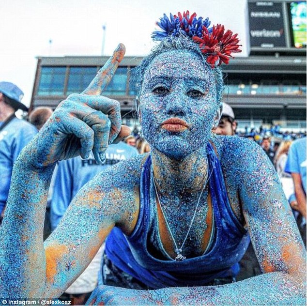 美国北卡罗来纳大学的大四女学生亚历克斯(Alex Koszeghy)在观看校内各类体育赛事时,常常在全身涂满蓝色亮片,为参赛选手呐喊助威。被称为“闪亮女孩”的她表示,此举帮助她重拾了自信心。