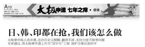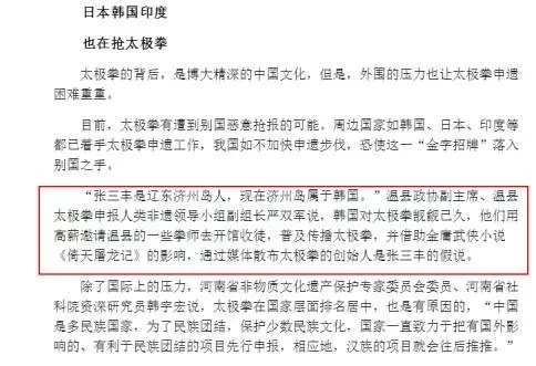 2014年4月初,中国某地方媒体刊发一系列关于太极拳申遗的报道。其中,某位太极拳申报人类非遗领导小组工作人员表示,张三丰是辽东济州岛人,现在济州岛属于韩国。韩国对太极拳觊觎已久,借助金庸武侠小说《倚天屠龙记》的影响,通过媒体散布太极拳的创始人是张三丰的假说。