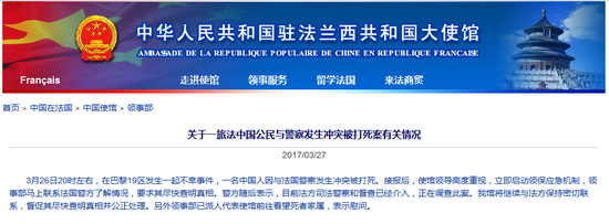 通报称,3月26日20时左右,在巴黎19区发生一起不幸事件,一名中国人因与法国警察发生冲突被打死。接报后,使馆领导高度重视,立即启动领保应急机制,领事部马上联系法国警方了解情况,要求其尽快查明真相。
