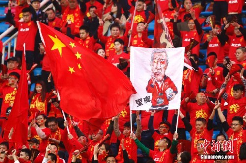 上周,国足在主场战胜韩国队,现场观众擎起中国队主教练里皮的漫画像。 中新社记者 富田 摄
