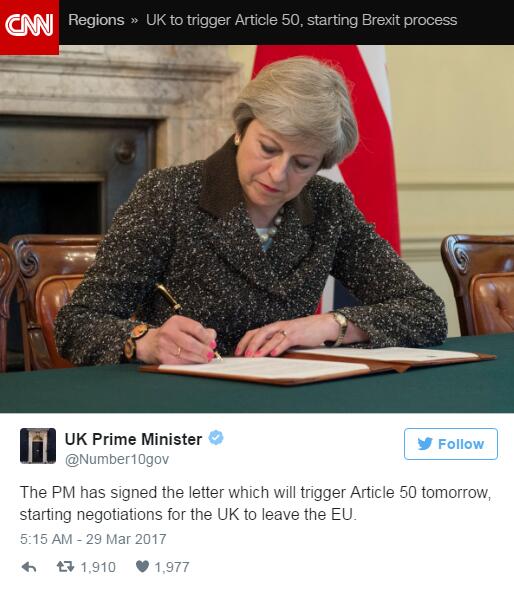【环球网报道 记者 王一】据美国有线电视新闻网3月28日报道,英国首相特雷莎·梅28日签署历史性的信函,将在29日交给欧盟,启动英国脱离欧盟程序。