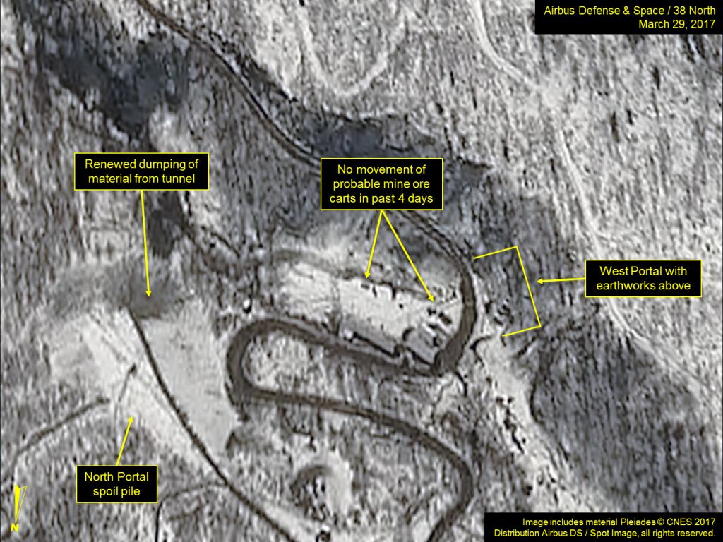 “北纬38度”称,在丰溪里试验场北部坑道处停留的卡车及拖车等都已消失。该网站还推测,过去几日朝鲜核试验准备或已完成,否则就是情况可能出现了变化。该网站认为,如果过去几天的活动确实和核试验有关,那么则可能暗示着核试验准备已完成,随时可以进行核试。