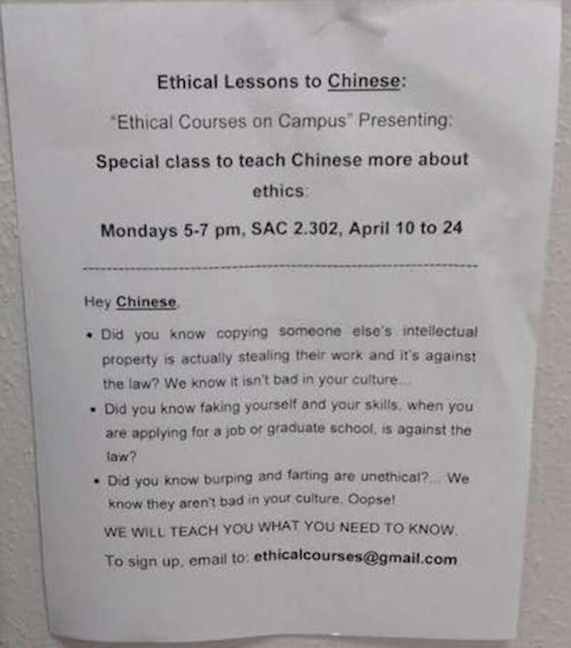 美国德州大学奥斯汀分校教学楼出现辱华布告,标题为“给中国人上的道德课”。